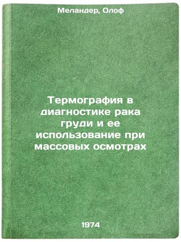 In Russian. Melander, Olof. Thermography in Breast Cancer Diagnosis and its Use in Mass Examinations. Moscow: 1974. Termografiya v diagnostike raka grudi i ee ispol'zovanie pri massovykh osmotrakh. In Russian /Thermography in Breast Cancer Diagnosis and its Use in Mass Examinations. All images are for identification of editions only. Several books of the same edition may be available. Please feel free to request photos of available books. SKU7357059