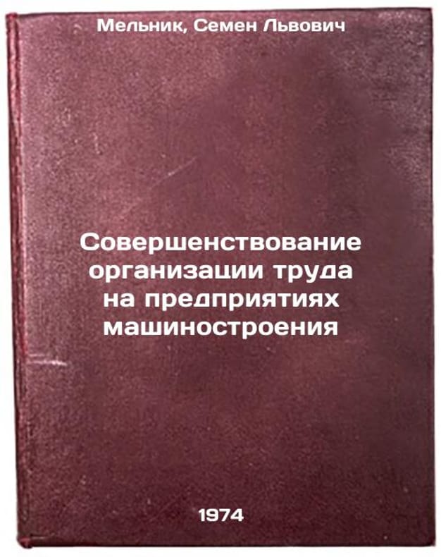 In Russian. Melnik, Semyon Lvovich. Improving Labour Organization in Mechanical Engineering Enterprises. Minsk: Belarus, 1974. Sovershenstvovanie organizatsii truda na predpriyatiyakh mashinostroeniya. In Russian /Improving Labour Organization in Mechanical Industries. All images are for identification of editions only. Several books of the same edition may be available. Please feel free to request photos of available books. SKU7361358
