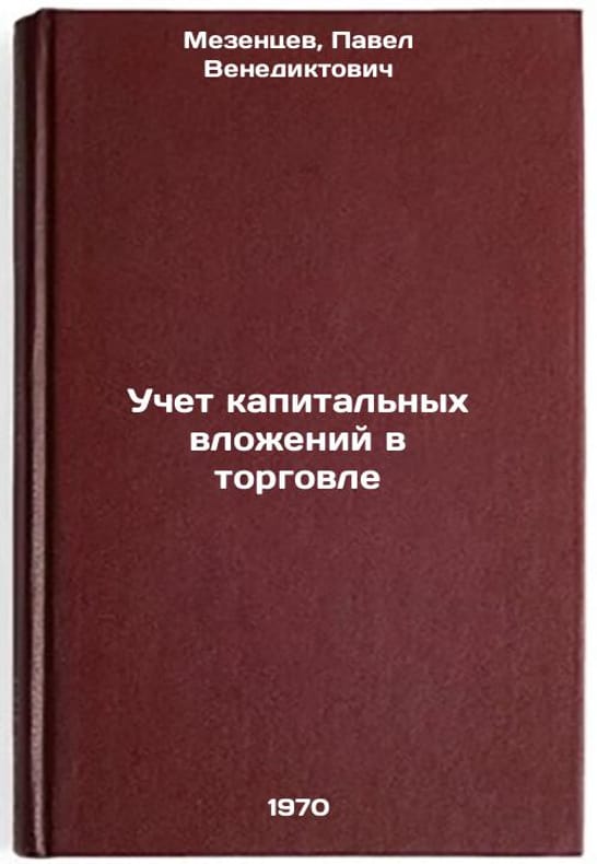 In Russian. Mezentsev, Pavel Venediktovich. Accounting for capital investment in trade. Leningrad: 1970. Uchet kapital'nykh vlozheniy v torgovle. In Russian /Accounting for capital investment in trade . All images are for identification of editions only. Several books of the same edition may be available. Please feel free to request photos of available books. SKU7363574