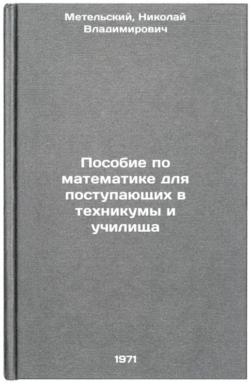 In Russian. Metelsky, Nikolai Vladimirovich. Mathematics manual for entrants to technical schools and colleges. Minsk: Higher School, 1971. Posobie po matematike dlya postupayushchikh v tekhnikumy i uchilishcha. In Russian /Mathematics Manual for Entry into Technical Schools and Schools . All images are for identification of editions only. Several books of the same edition may be available. Please feel free to request photos of available books. SKU7364065