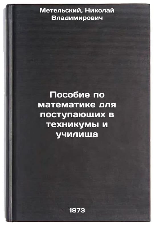 In Russian. Metelsky, Nikolai Vladimirovich. Mathematics manual for entrants to technical schools and colleges. Minsk: Higher School, 1971. Posobie po matematike dlya postupayushchikh v tekhnikumy i uchilishcha. In Russian /Mathematics Manual for Entry into Technical Schools and Schools . All images are for identification of editions only. Several books of the same edition may be available. Please feel free to request photos of available books. SKU7364065