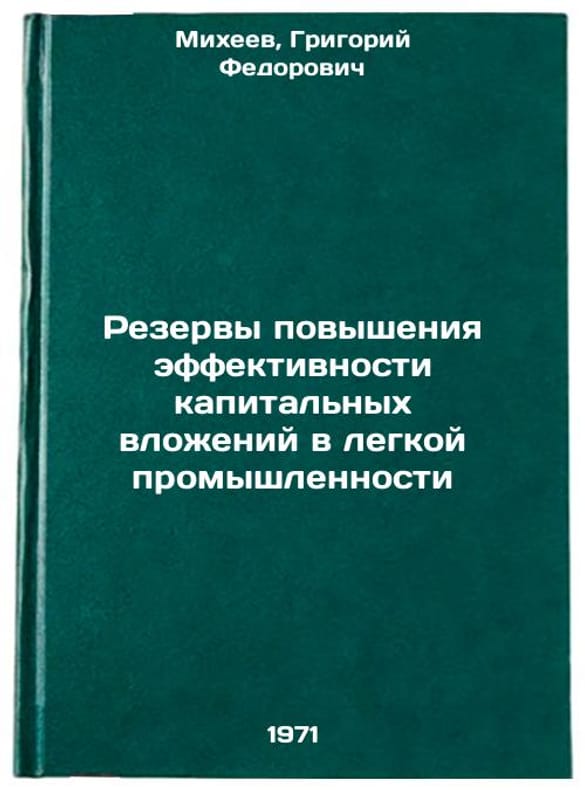 In Russian. Mikheev, Grigory Fedorovich. Reserves for improving the efficiency of capital investments in light industry. Moscow: 1971. Rezervy povysheniya effektivnosti kapital'nykh vlozheniy v legkoy promyshlennosti. In Russian /Capital Efficiency Reserves in Light Industry . All images are for identification of editions only. Several books of the same edition may be available. Please feel free to request photos of available books. SKU7373511