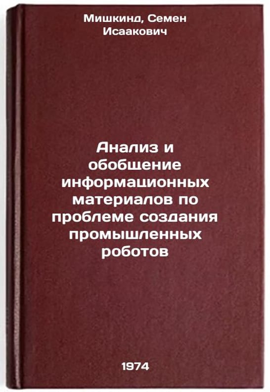 In Russian. Mishkind, Semyon Isaakovich. Analysis and generalization of information materials on the problem of industrial robots. Moscow: 1974. Analiz i obobshchenie informatsionnykh materialov po probleme sozdaniya promyshlennykh robotov. In Russian /Analysis and synthesis of information materials on the development of industrial robots. All images are for identification of editions only. Several books of the same edition may be available. Please feel free to request photos of available books. SKU7374772