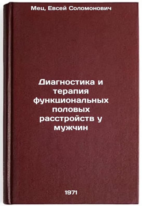 In Russian. Mets, Evsey Solomonovich. Diagnosis and Therapy of Functional Sexual Disorders in Men. Moscow: 1971. Diagnostika i terapiya funktsional'nykh polovykh rasstroystv u muzhchin. In Russian /Diagnosis and Therapy of Functional Sexual Disorders in Men . All images are for identification of editions only. Several books of the same edition may be available. Please feel free to request photos of available books. SKU7375696