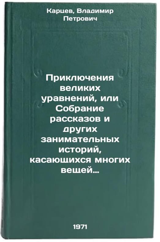 In Russian. Kartsev, Vladimir Petrovich. The adventures of the great equations, or the collection of stories and other fascinating stories concerning many things - thunder, lightning, fish, monsters, caravels, satellites - in short, all that has to do with Maxwell's equations. Priklyucheniya velikikh uravneniy, ili Sobranie rasskazov i drugikh zanimatel'nykh istoriy, kasayushchikhsya mnogikh veshchey - gromov, molniy, ryb, chudakov, karavell, sputnikov, - slovom, vsego togo, chto imeet otnoshenie k uravneniyam Maksvella. In Russian /The adventures of the great equations, or the collection of stories and other fascinating stories concerning many things - thunder, lightning, fish, monsters, caravels, satellites - in short, all that has to do with Maxwell's equations . All images are for identification of editions only. Several books of the same edition may be available. Please feel free to request photos of available books. SKU7386265
