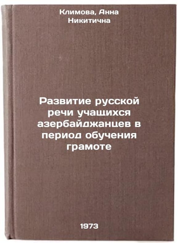 In Russian. Klimova, Anna Nikitichna. Development of Russian speech by Azerbaijani students during literacy training. Baku: Maarif, 1973. Razvitie russkoy rechi uchashchikhsya azerbaydzhantsev v period obucheniya gramote. In Russian/Development of Russian Language of Azerbaijani Students in the Period of Literacy. All images are for identification of editions only. Several books of the same edition may be available. Please feel free to request photos of available books. SKU7399461