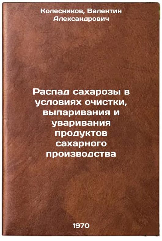 In Russian. Kolesnikov, Valentin Alexandrovich. Decay of sucrose under conditions of purification, evaporation and welding of sugar products. Moscow: 1970. Raspad sakharozy v usloviyakh ochistki, vyparivaniya i uvarivaniya produktov sakharnogo proizvodstva. In Russian /Decay of sucrose in the purification, evaporation and welding of sugar products . All images are for identification of editions only. Several books of the same edition may be available. Please feel free to request photos of available books. SKU7404425
