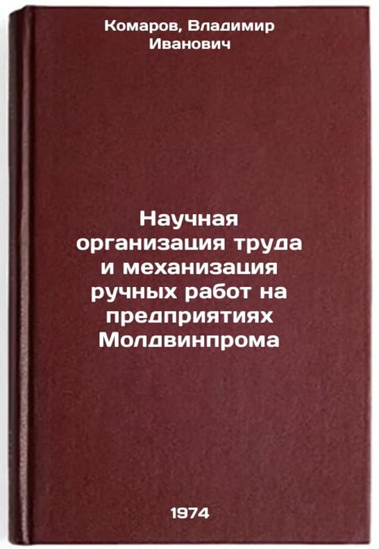 In Russian. Komarov, Vladimir Ivanovich. Scientific Organization of Labor and Mechanization of Hand Work at Moldvinprom Enterprises. Moscow: TsNIITEIpischprom, 1974. Nauchnaya organizatsiya truda i mekhanizatsiya ruchnykh rabot na predpriyatiyakh Moldvinproma. In Russian /Scientific organization of labor and mechanization of manual work in Moldvindprom enterprises. All images are for identification of editions only. Several books of the same edition may be available. Please feel free to request photos of available books. SKU7406147