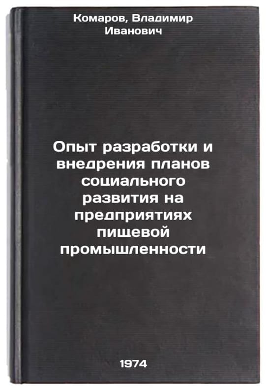 In Russian. Komarov, Vladimir Ivanovich. Experience of development and implementation of social development plans in food industry enterprises. Moscow: TsNIITEIpischprom, 1974. Opyt razrabotki i vnedreniya planov sotsial'nogo razvitiya na predpriyatiyakh pishchevoy promyshlennosti. In Russian /Experience in the formulation and implementation of social development plans in the food industry. All images are for identification of editions only. Several books of the same edition may be available. Please feel free to request photos of available books. SKU7406149