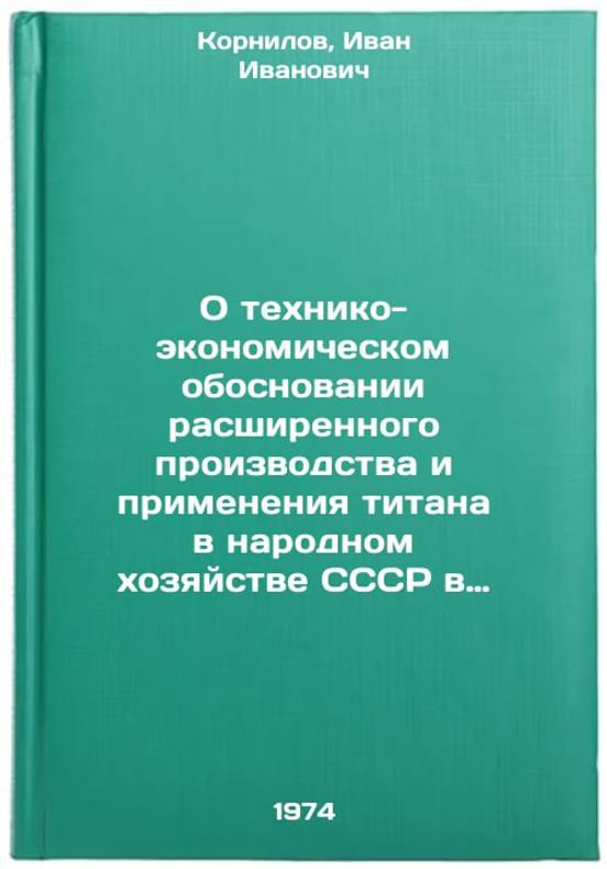 In Russian. Kornilov, Ivan Ivanovich. On the Feasibility Study of Expanded Production and Application of Titanium in the National Economy of the USSR in the Tenth Five-Year Period (1976-1980) and Projections of its Production until 1990-2000. Moscow: 1974. O tekhniko-ekonomicheskom obosnovanii rasshirennogo proizvodstva i primeneniya titana v narodnom khozyaystve SSSR v desyatom pyatiletii (1976-1980 gg.) i voprosy prognoza ego proizvodstva do 1990-2000 gg. In Russian /On the Feasibility Study of Expanded Production and Application of Titanium in the National Economy of the USSR in the Tenth Five-Year Period (1976-1980) and Issues of its Production Forecast to 1990-2000. All images are for identification of editions only. Several books of the same edition may be available. Please feel free to request photos of available books. SKU7410582