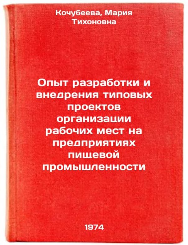 In Russian. Kochubeeva, Maria Tikhonovna. Experience in the development and implementation of standard projects for the organization of jobs in food industry enterprises. Moscow: TsNIITEIpischprom, 1974. Opyt razrabotki i vnedreniya tipovykh proektov organizatsii rabochikh mest na predpriyatiyakh pishchevoy promyshlennosti. In Russian /Experience in the development and implementation of model job management projects in the food processing industry. All images are for identification of editions only. Several books of the same edition may be available. Please feel free to request photos of available books. SKU7415781