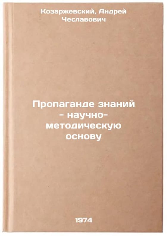 In Russian. Kozarzhevsky, Andrey Cheslavovich. Propaganda of knowledge - the scientific and methodological basis. Moscow: 1974. Propagande znaniy - nauchno-metodicheskuyu osnovu. In Russian /Promotion of knowledge - the scientific and methodological basis. All images are for identification of editions only. Several books of the same edition may be available. Please feel free to request photos of available books. SKU7416231