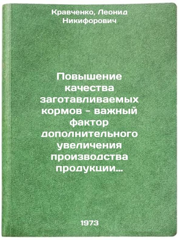 In Russian. Kravchenko, Leonid Nikiforovich. Improving the quality of harvested fodder is an important factor in an additional increase in livestock production. Voroshilovgrad: 1973. Povyshenie kachestva zagotavlivaemykh kormov - vazhnyy faktor dopolnitelnogo uvelicheniya proizvodstva produktsii zhivotnovodstva. In Russian/Improving the quality of feed harvested is an important factor in increasing livestock production. All images are for identification of editions only. Several books of the same edition may be available. Please feel free to request photos of available books. SKU7416565
