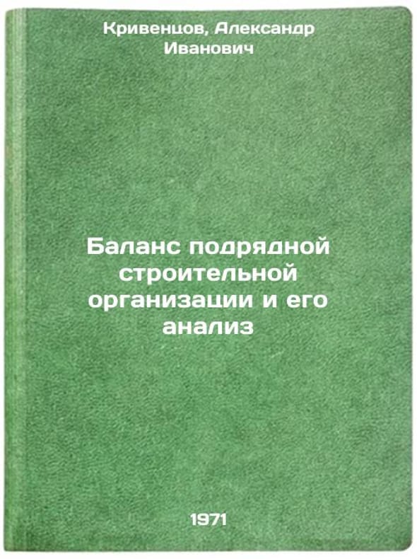 In Russian. Kriventsov, Alexander Ivanovich. Balance sheet of a construction contractor and its analysis. Moscow: Stroyizdat, 1971. Balans podryadnoy stroitel'noy organizatsii i ego analiz. In Russian /Construction contractor's balance sheet and analysis . All images are for identification of editions only. Several books of the same edition may be available. Please feel free to request photos of available books. SKU7418586