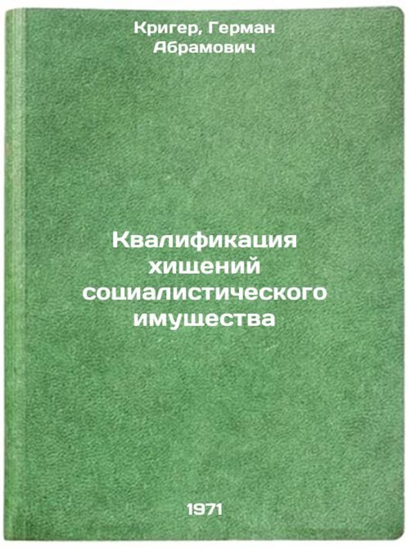 In Russian. Krieger, German Abramovich. Qualification of embezzlement of socialist property. Moscow: Yurid. lit., 1971. Kvalifikatsiya khishcheniy sotsialisticheskogo imushchestva. In Russian /Qualification of embezzlement of socialist property . All images are for identification of editions only. Several books of the same edition may be available. Please feel free to request photos of available books. SKU7418882