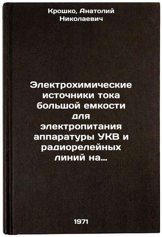In Russian. Kroshko, Anatoly Nikolaevich. Large-capacity electrochemical sources of current for power supply of VHF equipment and radio relay lines on gas main pipelines. Moscow: All-Union Scientific and Research Institute of Economics, Organization of Production, and Technological and Economic Information in the Gas Industry, 1971. Elektrokhimicheskie istochniki toka bol'shoy emkosti dlya elektropitaniya apparatury UKV i radioreleynykh liniy na magistral'nykh gazoprovodakh. In Russian /Large-capacity electrochemical current sources for the power supply of VHF equipment and radio relay lines on gas transmission lines . All images are for identification of editions only. Several books of the same edition may be available. Please feel free to request photos of available books. SKU7419541