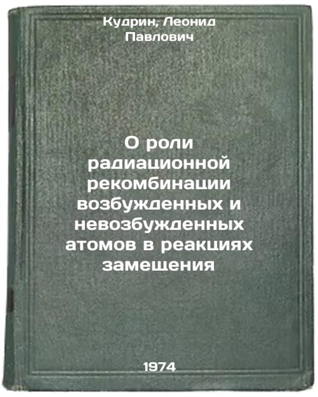 In Russian. Kudrin, Leonid Pavlovich. On the role of radiation recombination of excited and unexcited atoms in substitution reactions. Moscow: 1974. O roli radiatsionnoy rekombinatsii vozbuzhdennykh i nevozbuzhdennykh atomov v reaktsiyakh zameshcheniya. In Russian /On the role of radiation recombination of excited and unexcited atoms in substitution reactions. All images are for identification of editions only. Several books of the same edition may be available. Please feel free to request photos of available books. SKU7421030