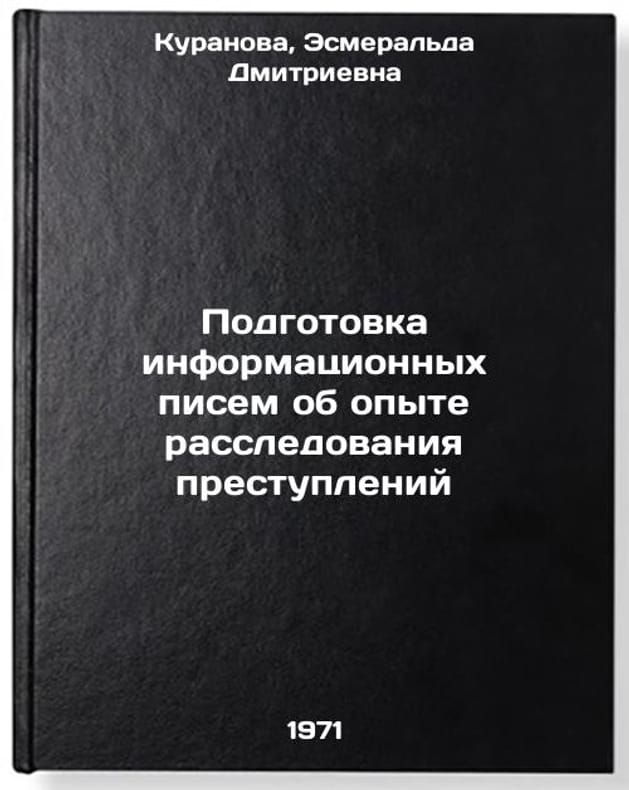 In Russian. Kuranova, Esmeralda Dmitrievna. Preparation of information letters on the experience of investigating crimes. Moscow: 1971. Podgotovka informatsionnykh pisem ob opyte rassledovaniya prestupleniy. In Russian /Preparation of newsletters on crime investigation experience . All images are for identification of editions only. Several books of the same edition may be available. Please feel free to request photos of available books. SKU7428624