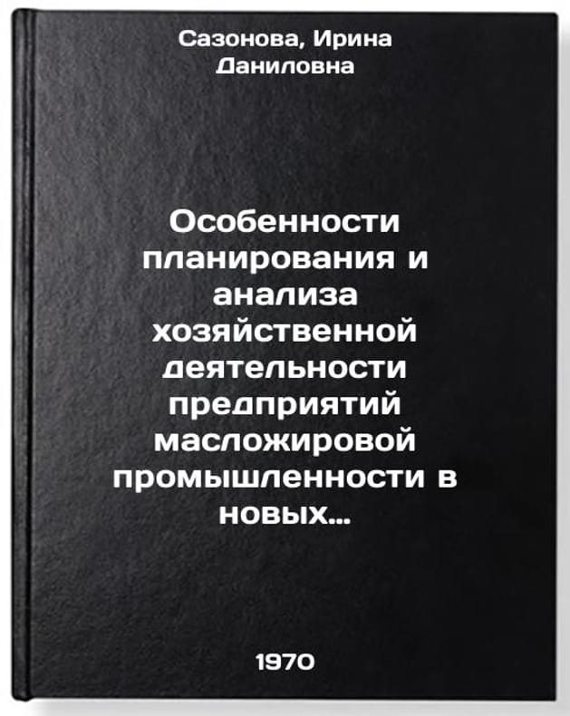 In Russian. Sazonova, Irina Danilovna. Peculiarities of Planning and Analysis of Economic Activities of Oil and Fat Industry Enterprises in New Working Conditions. Moscow: Food Industry, 1970. Osobennosti planirovaniya i analiza khozyaystvennoy deyatel'nosti predpriyatiy maslozhirovoy promyshlennosti v novykh usloviyakh raboty. In Russian /Peculiarities of planning and analysis of economic activities of oil and fat industry enterprises in new working conditions . All images are for identification of editions only. Several books of the same edition may be available. Please feel free to request photos of available books. SKU7433059