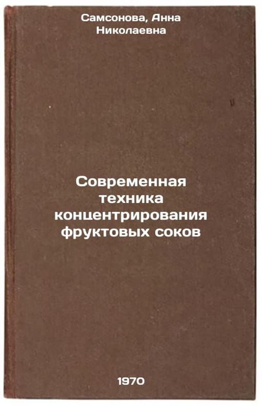 In Russian. Samsonova, Anna Nikolaevna. Modern technique of concentration of fruit juices. Moscow: 1970. Sovremennaya tekhnika kontsentrirovaniya fruktovykh sokov. In Russian /Modern technique for concentrating fruit juices . All images are for identification of editions only. Several books of the same edition may be available. Please feel free to request photos of available books. SKU7434917