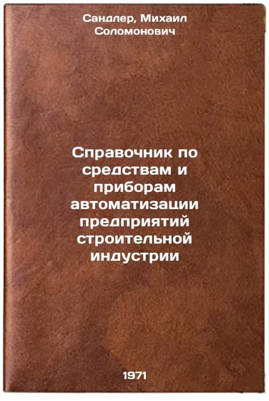 In Russian. Sandler, Mikhail Solomonovich. Guide to tools and devices for automation of enterprises of the construction industry. Leningrad: Stroyizdat. Leningrad branch, 1971. Spravochnik po sredstvam i priboram avtomatizatsii predpriyatiy stroitel'noy industrii. In Russian /Guide to Building Industry Automation Tools and Appliances . All images are for identification of editions only. Several books of the same edition may be available. Please feel free to request photos of available books. SKU7435022