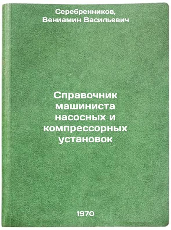 In Russian. Serebrennikov, Veniamin Vasilievich. Handbook of the pump and compressor unit operator. Kiev: Technika, 1970. Spravochnik mashinista nasosnykh i kompressornykh ustanovok. In Russian /Pumping and Compressor Plant Engineer's Guide . All images are for identification of editions only. Several books of the same edition may be available. Please feel free to request photos of available books. SKU7440011