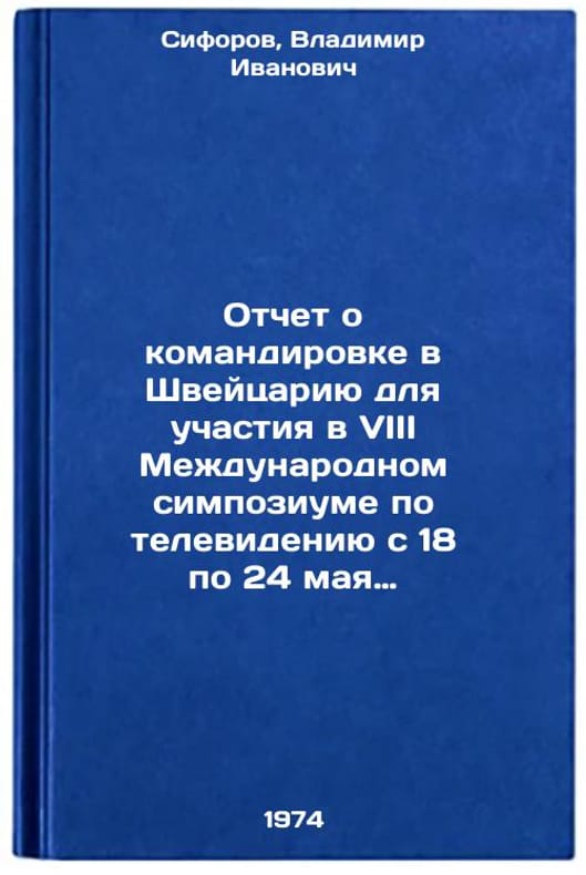 In Russian. Siforov, Vladimir Ivanovich. Report on a mission to Switzerland to participate in the VIII International Television Symposium from 18 to 24 May 1973 in Montreux. Moscow: 1974. Otchet o komandirovke v Shveytsariyu dlya uchastiya v VIII Mezhdunarodnom simpoziume po televideniyu s 18 po 24 maya 1973 g. v g. Montre. In Russian /Report on his mission to Switzerland to participate in the VIII International Television Symposium from 18 to 24 May 1973 in Montreux. All images are for identification of editions only. Several books of the same edition may be available. Please feel free to request photos of available books. SKU7443400
