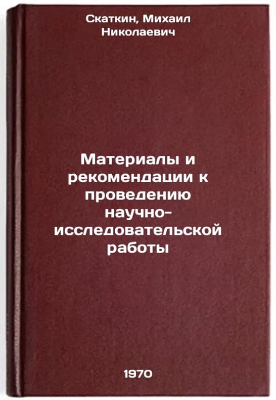 In Russian. Skatkin, Mikhail Nikolaevich. Materials and recommendations for carrying out research work. Moscow: 1970. Materialy i rekomendatsii k provedeniyu nauchno-issledovatel'skoy raboty. In Russian /Research inputs and recommendations . All images are for identification of editions only. Several books of the same edition may be available. Please feel free to request photos of available books. SKU7445927