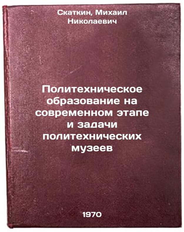 In Russian. Skatkin, Mikhail Nikolaevich. Polytechnic education at the present stage and the tasks of polytechnic museums. Moscow: Znanie, 1970. Politekhnicheskoe obrazovanie na sovremennom etape i zadachi politekhnicheskikh muzeev. In Russian /Modern Polytechnic Education and the Tasks of Polytechnic Museums . All images are for identification of editions only. Several books of the same edition may be available. Please feel free to request photos of available books. SKU7445932
