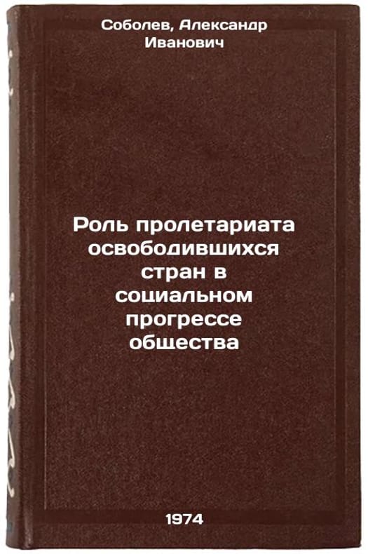 In Russian. Sobolev, Alexander Ivanovich. The Role of the Proletariat of the Liberated Countries in the Social Progress of Society. Moscow: Science, 1974. Rol' proletariata osvobodivshikhsya stran v sotsial'nom progresse obshchestva. In Russian /The role of the proletariat of the liberated countries in the social progress of society. All images are for identification of editions only. Several books of the same edition may be available. Please feel free to request photos of available books. SKU7452589