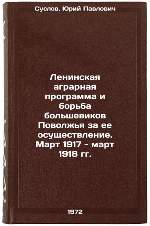In Russian. Suslov, Yuri Pavlovich. Lenins agrarian program and the struggle of the Bolsheviks of the Volga region for its implementation. March 1917 - March 1918 Saratov: Publishing House of Saratov, 1972. Leninskaya agrarnaya programma i borba bolshevikov Povolzhya za ee osushchestvlenie. Mart 1917 - mart 1918 gg. In Russian/Lenins agrarian program and the struggle of the Bolsheviks of the Volga region for its implementation. March 1917-March 1918. All images are for identification of editions only. Several books of the same edition may be available. Please feel free to request photos of available books. SKU7464211