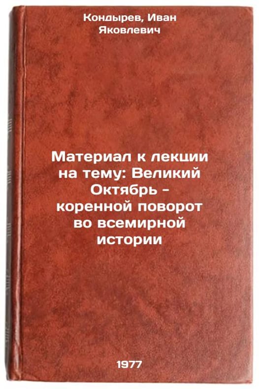 In Russian. Kondyrev, Ivan Yakovlevich. Material for a lecture on the Great October - a radical turn in world history. Leningrad: 1977. Material k lektsii na temu: Velikiy Oktyabr' - korennoy povorot vo vsemirnoy istorii. In Russian /Contribution to the lecture on the Great October: a fundamental turning point in world history . All images are for identification of editions only. Several books of the same edition may be available. Please feel free to request photos of available books. SKU7471166