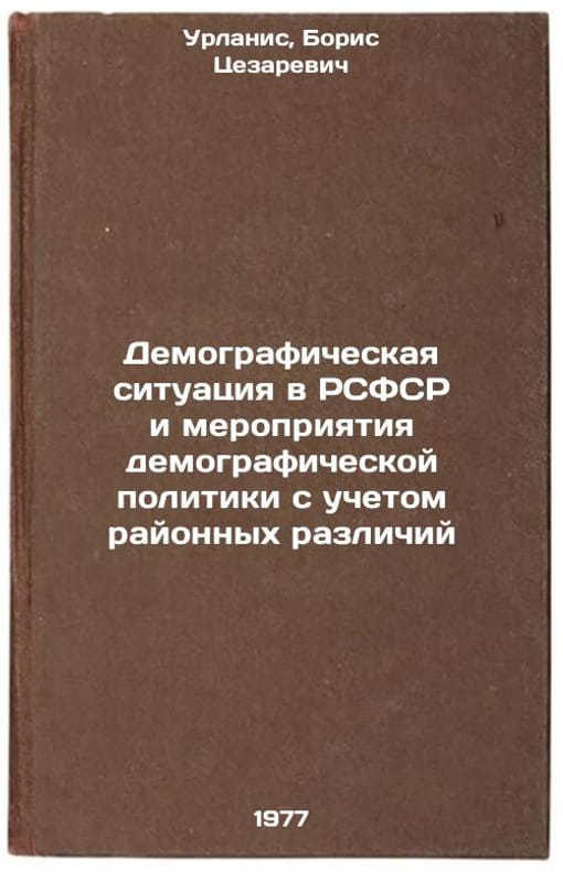 In Russian. Urlanis, Boris Tsesarevich. Demographic situation in the RSFSR and measures of demographic policy taking into account regional differences. Moscow: 1977. Demograficheskaya situatsiya v RSFSR i meropriyatiya demograficheskoy politiki s uchetom rayonnykh razlichiy. In Russian /Demographic situation in the RSFSR and measures of population policy taking into account regional differences . All images are for identification of editions only. Several books of the same edition may be available. Please feel free to request photos of available books. SKU7475299
