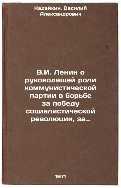 In Russian. Kadeikin, Vasily Alexandrovich. V.I. Lenin on the leading role of the Communist Party in the struggle for the victory of the socialist revolution, for the building of socialism and communism. Kyiv: 1971. V.I. Lenin o rukovodyashchey roli kommunisticheskoy partii v bor'be za pobedu sotsialisticheskoy revolyutsii, za postroenie sotsializma i kommunizma. In Russian /V.I. Lenin on the leadership role of the Communist Party in the struggle for the victory of the socialist revolution, for the building of socialism and communism . All images are for identification of editions only. Several books of the same edition may be available. Please feel free to request photos of available books. SKU7481108