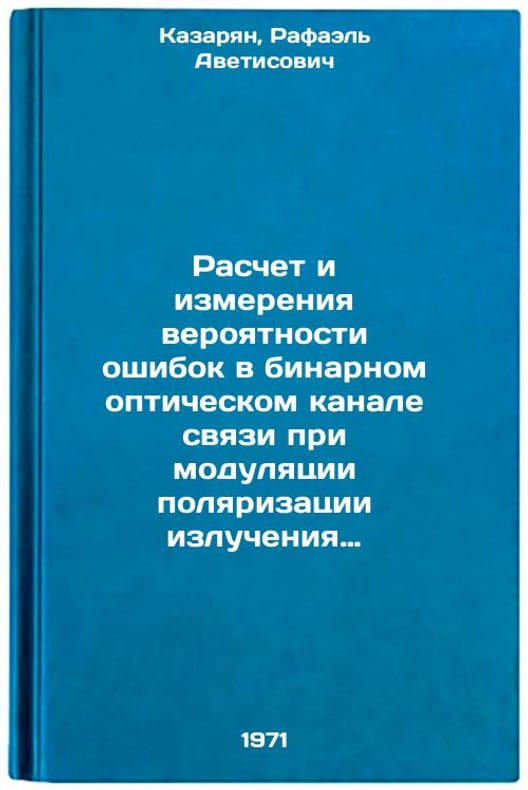 In Russian. Kazaryan, Rafael Avetisovich. Calculation and measurement of the probability of errors in the binary optical communication channel when modulating the polarization of OCG radiation. Yerevan: 1971. Raschet i izmereniya veroyatnosti oshibok v binarnom opticheskom kanale svyazi pri modulyatsii polyarizatsii izlucheniya OKG. In Russian /Calculation and measurement of the probability of errors in the binary optical communication channel when modulating the polarization of OCG radiation . All images are for identification of editions only. Several books of the same edition may be available. Please feel free to request photos of available books. SKU7482037