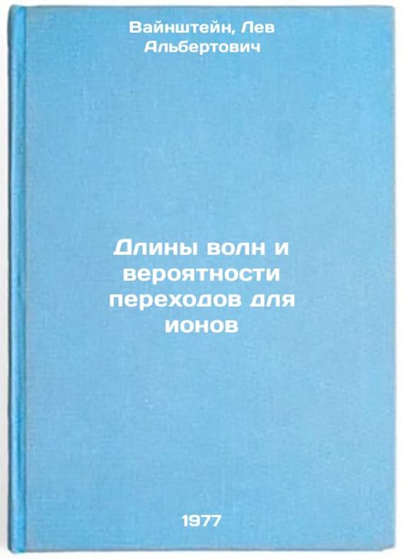 In Russian. Weinstein, Lev Albertovich. Wavelengths and probabilities of transitions for ions. Moscow: 1976. Dliny voln i veroyatnosti perekhodov dlya ionov. In Russian /Wavelengths and transition probabilities for ions . All images are for identification of editions only. Several books of the same edition may be available. Please feel free to request photos of available books. SKU7584844