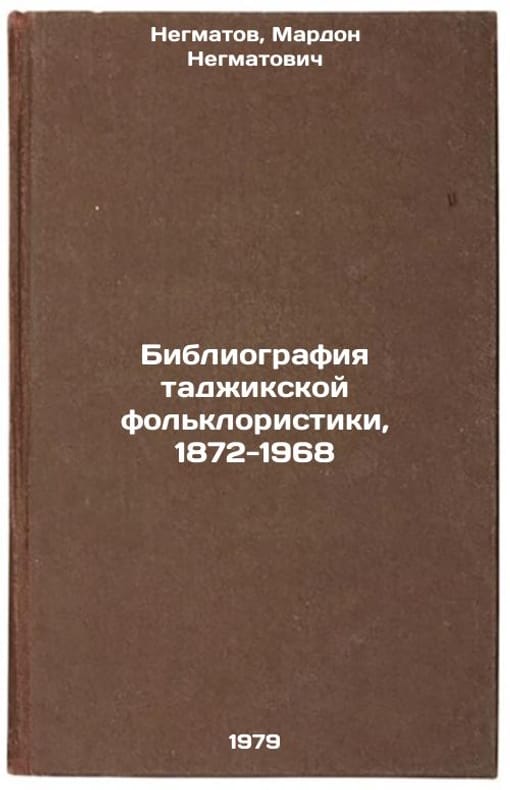 "Short description: In Russian. Negmatov, Mardon Negmatovich. Bibliography of Tajik folklore, 1872-1968. Dushanbe: Donish, 1979 Bibliografiya tadzhikskoy folkloristiki, 1872-1968/Bibliography of Tajik Folklore, 1872-1968 In Russian. All images are for identification of editions only. Several books of the same edition may be available. Please feel free to request photos of available books. SKU7585532"