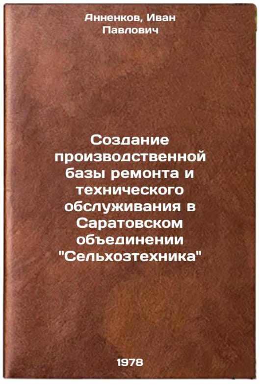 In Russian. Annenkov, Ivan Pavlovich. Creation of a production base for repair and maintenance at the Saratov Association of Agricultural Technology. Moscow: Central Research Institute of Technology in / about Soyuz Agricultural Technologiya, 1978 Sozdanie proizvodstvennoy bazy remonta i tekhnicheskogo obsluzhivaniya v Saratovskom obedinenii Selkhoztekhnika/Creation of a production base for repair and maintenance at the Saratov Association of Agricultural Technology In Russian. All images are for identification of editions only. Several books of the same edition may be available. Please feel free to request photos of available books. SKU7619883