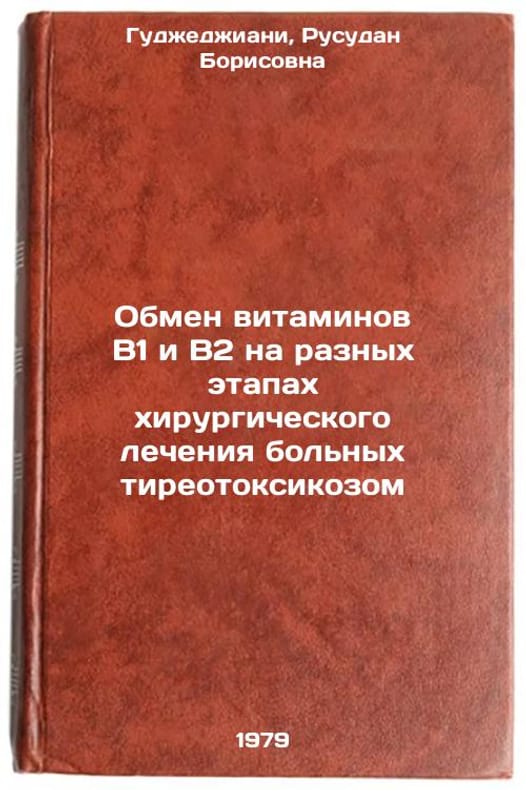 In Russian. Gudjedzhiani, Rusudan Borisovna. Exchange of vitamins B1 and B2 at different stages of surgical treatment of thyrotoxicosis patients. Tbilisi: Metsniereba, 1979 Obmen vitaminov V1 i V2 na raznykh etapakh khirurgicheskogo lecheniya bolnykh tireotoksikozom/Exchange of vitamins B1 and B2 at different stages of the surgical treatment of thyrotoxicosis In Russian. All images are for identification of editions only. Several books of the same edition may be available. Please feel free to request photos of available books. SKU7621421