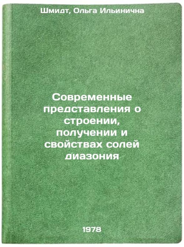 In Russian. Schmidt, Olga Ilyinichna. Modern ideas about the structure, production and properties of diazonium salts. Irkutsk: Irkut. PTI, 1978 Sovremennye predstavleniya o stroenii, poluchenii i svoystvakh soley diazoniya/Current understanding of the structure, production, and properties of diazonium salts In Russian. All images are for identification of editions only. Several books of the same edition may be available. Please feel free to request photos of available books. SKU7629012