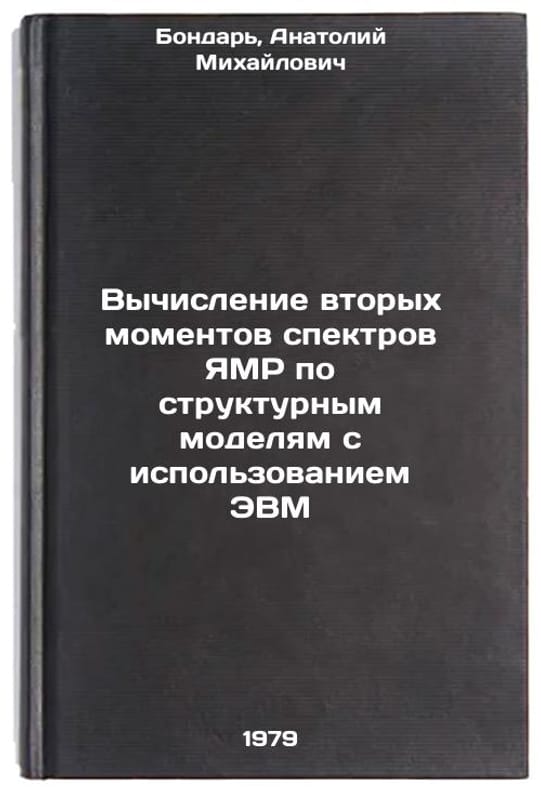 In Russian. Bondar, Anatoly Mikhailovich. Calculation of the second moments of the NMR spectra using structural models using computers. Moscow: 1978 (vol. 1979) Vychislenie vtorykh momentov spektrov YaMR po strukturnym modelyam s ispolzovaniem EVM/Calculation of the second moments of NMR spectra by structural models using computer In Russian. All images are for identification of editions only. Several books of the same edition may be available. Please feel free to request photos of available books. SKU7629586