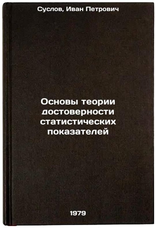 In Russian. Suslov, Ivan Petrovich. Fundamentals of the theory of the reliability of statistical indicators. Novosibirsk: Science. Siberian Branch, 1979 Osnovy teorii dostovernosti statisticheskikh pokazateley/Fundamentals of Statistical Validity Theory In Russian. All images are for identification of editions only. Several books of the same edition may be available. Please feel free to request photos of available books. SKU7638128
