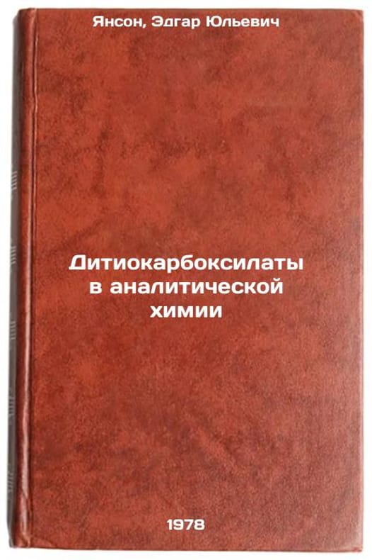 In Russian. Janson, Edgar Yulievich. Dithiocarboxylate in analytical chemistry. Riga: Zinatne, 1978 Ditiokarboksilaty v analiticheskoy khimii/Dithiocarboxylate in analytical chemistry In Russian. All images are for identification of editions only. Several books of the same edition may be available. Please feel free to request photos of available books. SKU7641203