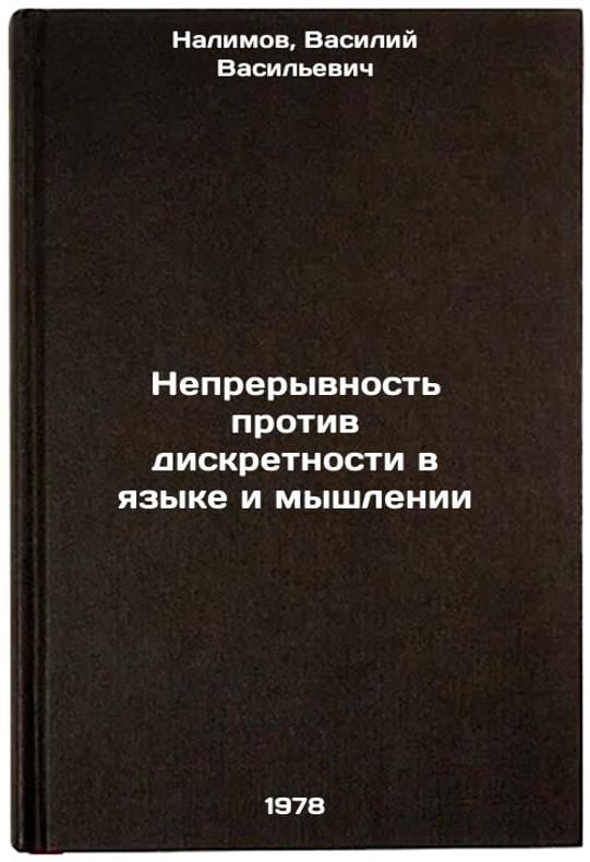 In Russian. Nalimov, Vasily Vasilyevich. Continuity versus discretion in language and thought. Tbilisi: Publishing House of Tbilisi, 1978 Nepreryvnost protiv diskretnosti v yazyke i myshlenii/Continuity vs. Discretion in Language and Thinking In Russian. All images are for identification of editions only. Several books of the same edition may be available. Please feel free to request photos of available books. SKU7645408