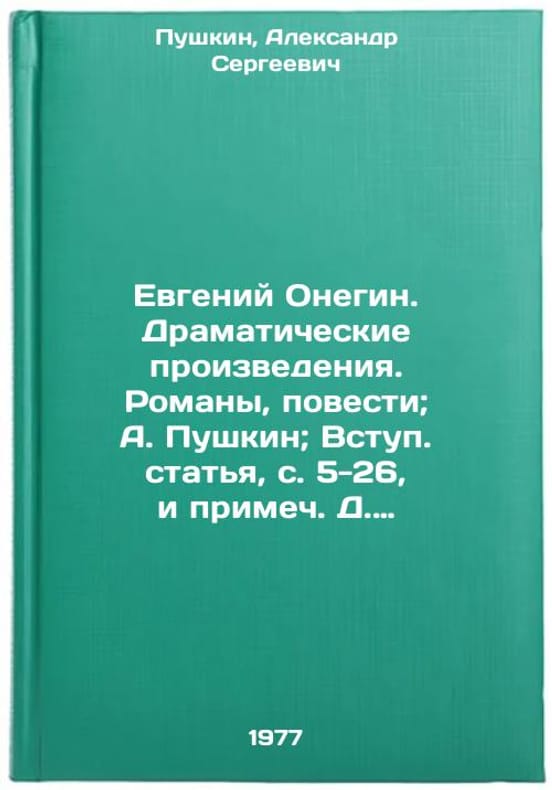 "In Russian. Pushkin, Alexander Sergeyevich. Evgeny Onegin. Dramatic Works. Novels, Novels; A. Pushkin; [Introductory article, pp. 5-26, and D. Blagogo's Note]. Moscow: Art Lite, 1977. Evgeniy Onegin. Dramaticheskie proizvedeniya. Romany, povesti; A. Pushkin; Vstup. stat'ya, s. 5-26, i primech. D. Blagogo. In Russian /Evgeny Onegin. Dramatic Works. Novels, Novels; A. Pushkin; Introductory article, pp. 5-26, and D. Blagogo's Note . All images are for identification of editions only. Several books of the same edition may be available. Please feel free to request photos of available books. SKU7648861"