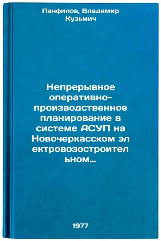 In Russian. Panfilov, Vladimir Kuzmich. Continuous operational and production planning in the ACS system at the Novocherkassk Electric Locomotive Plant. Moscow: Informelektro, 1977. Nepreryvnoe operativno-proizvodstvennoe planirovanie v sisteme ASUP na Novocherkasskom elektrovozostroitel'nom zavode. In Russian /Continuous operational and production planning in the ACS system at the Novocherkassk Electric Locomotive Plant . All images are for identification of editions only. Several books of the same edition may be available. Please feel free to request photos of available books. SKU7649249