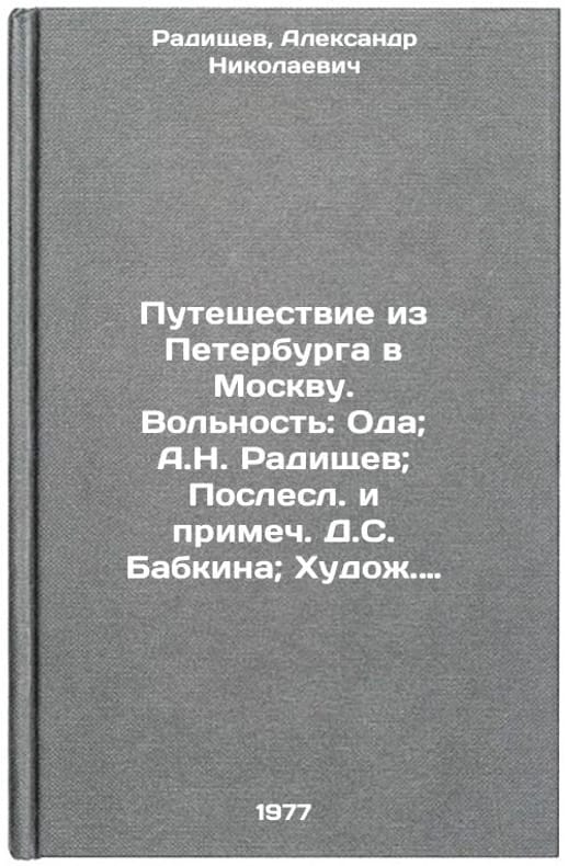 "In Russian. Radishchev, Alexander Nikolaevich. Journey from St. Petersburg to Moscow. Freedom: Ode; A.N. Radishchev; [Post and Note by D. S. Babkina; Artist O.P. Shamro]. Leningrad: Lenizdat, 1977. Puteshestvie iz Peterburga v Moskvu. Vol'nost': Oda; A.N. Radishchev; Poslesl. i primech. D.S. Babkina; Khudozh. O.P. Shamro. In Russian /Journey from St. Petersburg to Moscow. Freedom: Ode; A.N. Radishchev; Post and Note by D. S. Babkina; Artist O.P. Shamro . All images are for identification of editions only. Several books of the same edition may be available. Please feel free to request photos of available books. SKU7649568"