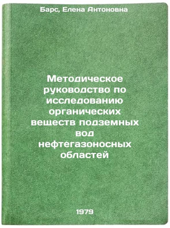 In Russian. Bars, Elena Antonovna. Methodological guide for the study of organic substances of groundwater in oil and gas-bearing areas. Moscow: Nedra, 1979 Metodicheskoe rukovodstvo po issledovaniyu organicheskikh veshchestv podzemnykh vod neftegazonosnykh oblastey/Methodological Guidance for the Study of Groundwater Organics in Oil and Gas-rich Areas In Russian. All images are for identification of editions only. Several books of the same edition may be available. Please feel free to request photos of available books. SKU7650912