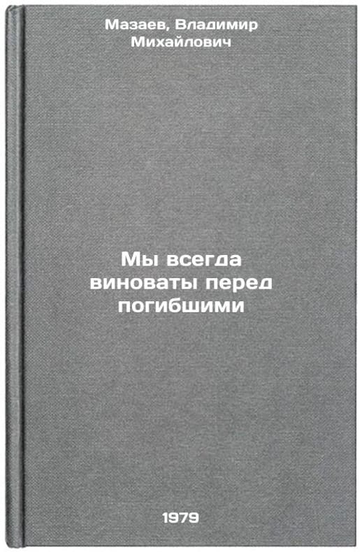 In Russian. Mazaev, Vladimir Mikhailovich. We are always guilty before the dead. Kemerovo: Book of Editions, 1979 My vsegda vinovaty pered pogibshimi/We are always to blame for the dead In Russian. All images are for identification of editions only. Several books of the same edition may be available. Please feel free to request photos of available books. SKU7659427