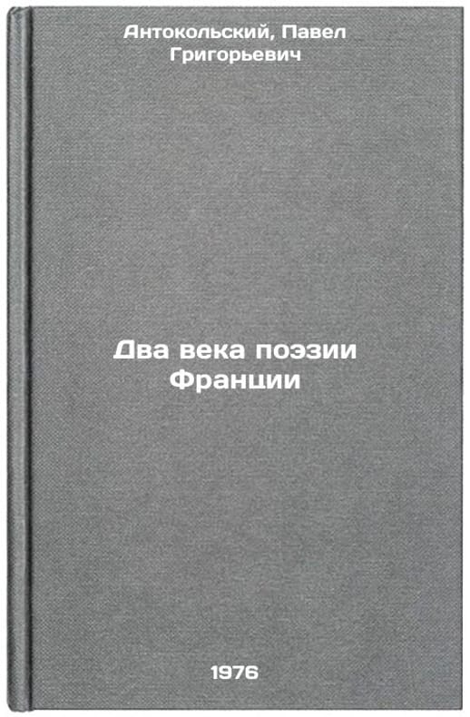 In Russian. Antokolsky, Pavel Grigorievich. Two Centuries of Poetry in France. Moscow: Art Lite, 1976. All images are for identification of editions only. Several books of the same edition may be available. Please feel free to request photos of available books. SKU7663904